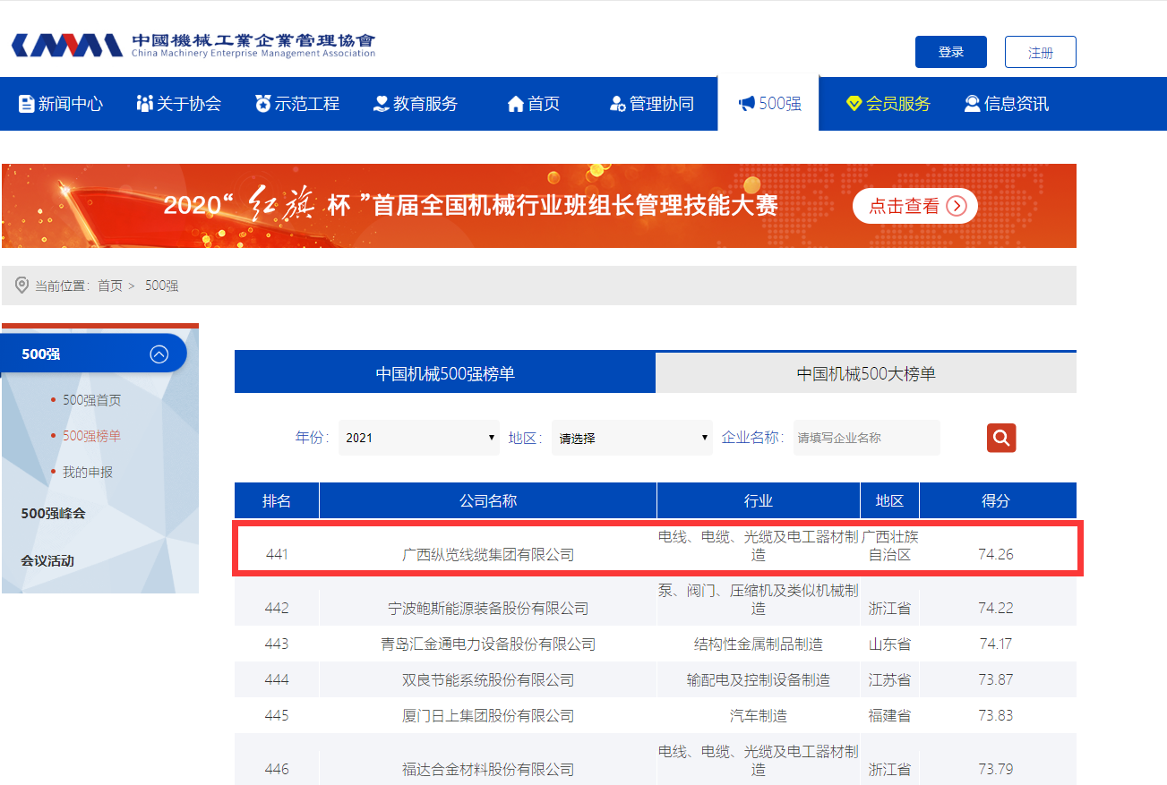 日前,2021年中國機械500強榜單發(fā)布,廣西縱覽線纜集團有限公司位列441強,是廣西電線電纜行業(yè)唯一上榜企業(yè)。在新冠疫情和原材料價格高漲疊加因素環(huán)境下,我集團連續(xù)上榜中國機械500強企業(yè)榜單,充分彰顯了縱覽線纜集團在科研技術、質(zhì)量管控、市場開拓、創(chuàng)新發(fā)展上的綜合實力和高質(zhì)量發(fā)展的水平,將有力促進縱覽品牌的美譽度和市場影響力。