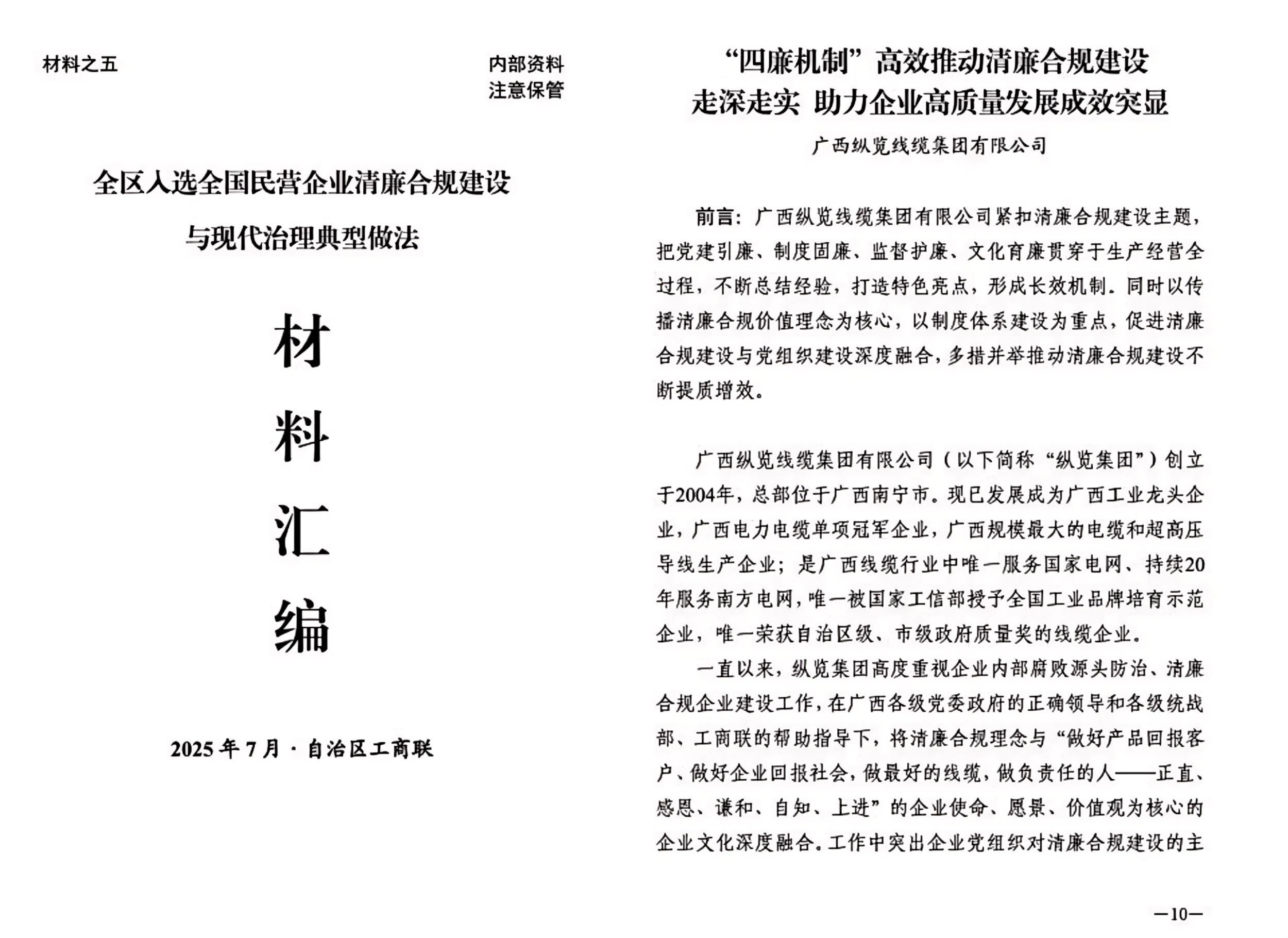 7月14-15日,2025年全區(qū)清廉民企建設(shè)提質(zhì)增效現(xiàn)場(chǎng)推進(jìn)活動(dòng)暨民營(yíng)企業(yè)建立完善中國(guó)特色現(xiàn)代企業(yè)制度試點(diǎn)工作啟動(dòng)會(huì)在來賓召開 。來賓市委書記何朝建致辭;自治區(qū)黨委統(tǒng)戰(zhàn)部副部長(zhǎng)、工商聯(lián)黨組書記、清廉民企建設(shè)專責(zé)小組組長(zhǎng)丘德彬,自治區(qū)黨委巡視組副組長(zhǎng)、巡視專員、清廉廣西領(lǐng)導(dǎo)小組辦公室綜合組副組長(zhǎng)張勤儉分別講話。期間,與會(huì)代表實(shí)地觀摩學(xué)習(xí)了來賓有關(guān)企業(yè)、商會(huì)清廉建設(shè)的做法經(jīng)驗(yàn),聆聽了浙大教授作的民營(yíng)企業(yè)治理現(xiàn)代化專題輔導(dǎo);會(huì)議還發(fā)放了《全區(qū)入選全國(guó)民營(yíng)企業(yè)清廉合規(guī)建設(shè)與現(xiàn)代化治理典型做法》等交流學(xué)習(xí)材料,我縱覽線纜集團(tuán)的《“四廉機(jī)制”高效推動(dòng)清廉合規(guī)建設(shè)走深走實(shí) 助力企業(yè)高質(zhì)量發(fā)展成效突顯》做法代表廣西線纜行業(yè)與其他19家民營(yíng)企業(yè)光榮入選。 一直以來,我集團(tuán)高度重視企業(yè)內(nèi)部腐敗源頭防治、清廉合規(guī)企業(yè)建設(shè)工作,在廣西各級(jí)黨委政府的正確領(lǐng)導(dǎo)和各級(jí)統(tǒng)戰(zhàn)部、工商聯(lián)的幫助指導(dǎo)下,將清廉合規(guī)理念與“做好產(chǎn)品回報(bào)客戶、做好企業(yè)回報(bào)社會(huì),做最好的線纜,做負(fù)責(zé)任的人——正直、感恩、謙和、自知、上進(jìn)”的企業(yè)使命、愿景、價(jià)值觀為核心的企業(yè)文化深度融合。工作中突出企業(yè)黨組織對(duì)清廉合規(guī)建設(shè)的主導(dǎo)地位,充分發(fā)揮黨支部的政治功能和組織功能,多措并舉擦亮民企清廉底色,實(shí)現(xiàn)了清廉合規(guī)建設(shè)與企業(yè)經(jīng)營(yíng)工作有機(jī)契合、一體推動(dòng)、兩不誤雙促進(jìn);形成了“優(yōu)在制度、重在執(zhí)行、嚴(yán)在監(jiān)督、成在整改”這一縱覽集團(tuán)獨(dú)特、長(zhǎng)效的企業(yè)內(nèi)部腐敗源頭防治機(jī)制和企業(yè)經(jīng)營(yíng)管理體系,實(shí)現(xiàn)了清廉合規(guī)建設(shè)與企業(yè)生產(chǎn)經(jīng)營(yíng)有機(jī)契合、一體推動(dòng)、兩不誤雙促進(jìn),在構(gòu)建親清統(tǒng)一的新型政商關(guān)系、營(yíng)造風(fēng)清氣正的市場(chǎng)環(huán)境中進(jìn)行了卓有成效的探索和實(shí)踐,有效推動(dòng)了企業(yè)內(nèi)部腐敗源頭防治、清廉合規(guī)建設(shè)在縱覽集團(tuán)走深走實(shí),取得積極成效。 我們真切體會(huì)到:清廉合規(guī)建設(shè)在縱覽集團(tuán)高質(zhì)量發(fā)展過程中發(fā)揮著重要作用,有效推動(dòng)了企業(yè)內(nèi)外關(guān)系的和諧發(fā)展和社會(huì)責(zé)任的履行,有效推動(dòng)了經(jīng)營(yíng)業(yè)務(wù)的拓展、社會(huì)形象的提升。一方面,集團(tuán)實(shí)現(xiàn)了連續(xù)6年進(jìn)入中國(guó)機(jī)械500強(qiáng)、中國(guó)線纜產(chǎn)業(yè)最具競(jìng)爭(zhēng)力企業(yè) 100 強(qiáng),廣西制造業(yè)企業(yè)、廣西民營(yíng)企業(yè)、廣西民營(yíng)企業(yè)制造業(yè) 100 強(qiáng);實(shí)現(xiàn)連續(xù) 5 年獲評(píng)廣西守合同重信用企業(yè),連續(xù)9年被國(guó)家稅務(wù)總局評(píng)為“納稅信用 A級(jí)企業(yè)”;先后榮獲“國(guó)家高新技術(shù)企業(yè)、國(guó)家級(jí)綠色工廠、國(guó)家知識(shí)產(chǎn)權(quán)優(yōu)勢(shì)企業(yè),廣西工業(yè)龍頭企業(yè)、廣西電力電纜單項(xiàng)冠軍企業(yè)、廣西壯族自治區(qū)主席質(zhì)量獎(jiǎng)提名獎(jiǎng)、廣西智能工廠示范企業(yè)、廣西專精特新企業(yè)、廣西工業(yè)企業(yè)質(zhì)量管理標(biāo)桿、廣西技術(shù)創(chuàng)新示范企業(yè)、南寧市市長(zhǎng)質(zhì)量獎(jiǎng)、南寧市清廉民營(yíng)企業(yè)建設(shè)標(biāo)桿企業(yè)、南寧市清廉民營(yíng)企業(yè)建設(shè)先進(jìn)單位等榮譽(yù)稱號(hào)。另一方面,集團(tuán)重點(diǎn)優(yōu)質(zhì)客戶實(shí)現(xiàn)持續(xù)增加,在電網(wǎng)建設(shè)領(lǐng)域服務(wù)區(qū)域從南方電網(wǎng)的5省區(qū)已擴(kuò)展至全國(guó)16個(gè)省區(qū)市的同時(shí),還成為中交集團(tuán)、中建集團(tuán)、中能建集團(tuán)、廣西投資集團(tuán)、廣西北港集團(tuán)、廣西北投集團(tuán)、廣西交投集團(tuán)、廣西建工集團(tuán)、廣西現(xiàn)代物流集團(tuán)、柳鋼集團(tuán)和南寧軌道、南寧產(chǎn)投、南寧城投、建寧水務(wù)集團(tuán)等20多家央地國(guó)企的優(yōu)秀供應(yīng)商。集團(tuán)結(jié)合企業(yè)經(jīng)營(yíng)實(shí)際,在三年多的新冠疫情期間,主動(dòng)承擔(dān)各區(qū)疫情防控所需的“小湯山”醫(yī)院用電線纜的緊急供應(yīng)任務(wù);向12所學(xué)校開展捐資助學(xué)活動(dòng);通過全額資助學(xué)費(fèi)方式,支持、鼓勵(lì)廣西學(xué)子就讀河南工學(xué)院電線電纜專業(yè),為廣西培養(yǎng)電線電纜專業(yè)人才;集團(tuán)每銷售1公里電線電纜產(chǎn)品向南寧市見義勇為基金會(huì)捐獻(xiàn)1元人民幣等社會(huì)公益活動(dòng)受到社會(huì)各界廣泛贊譽(yù)